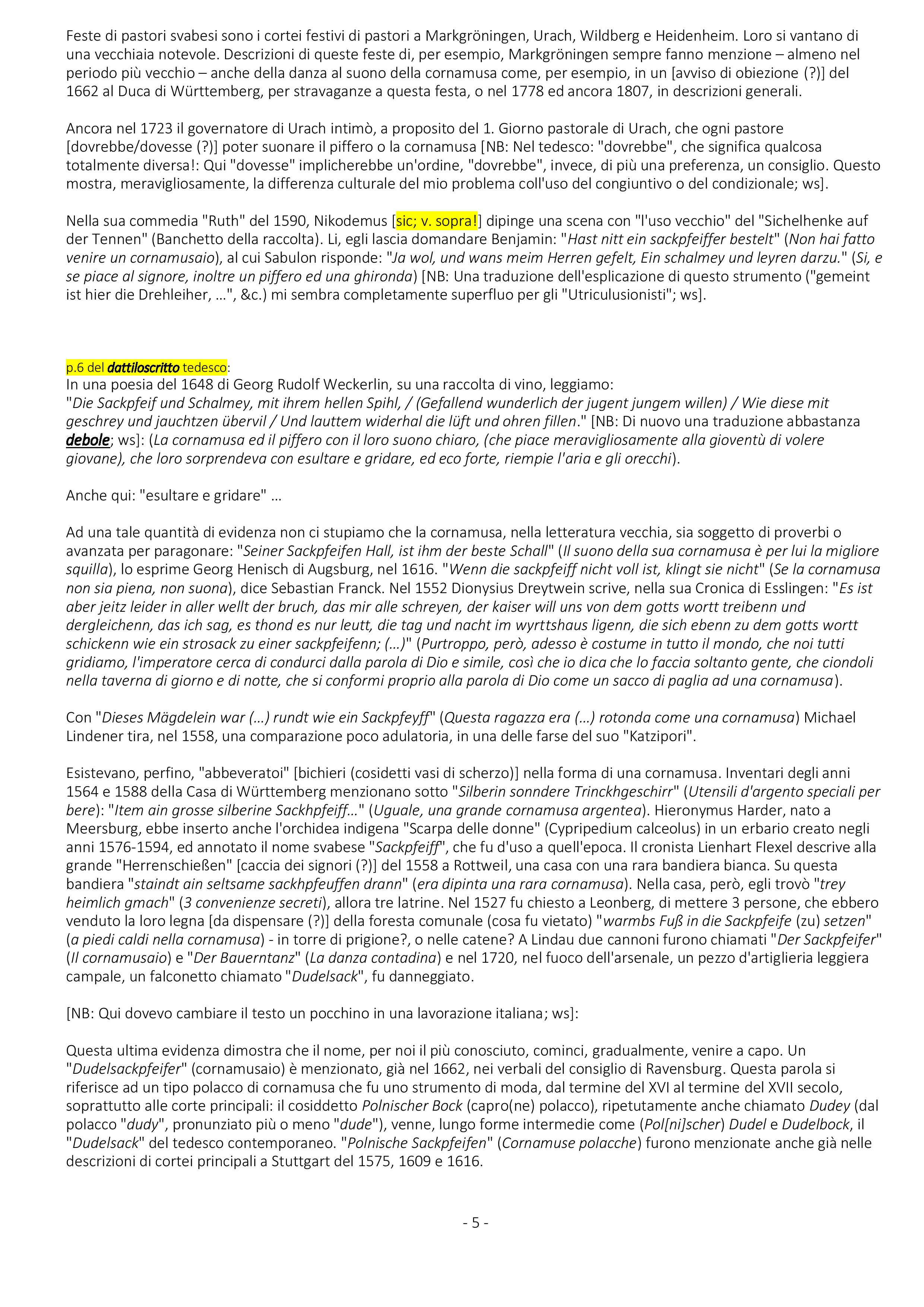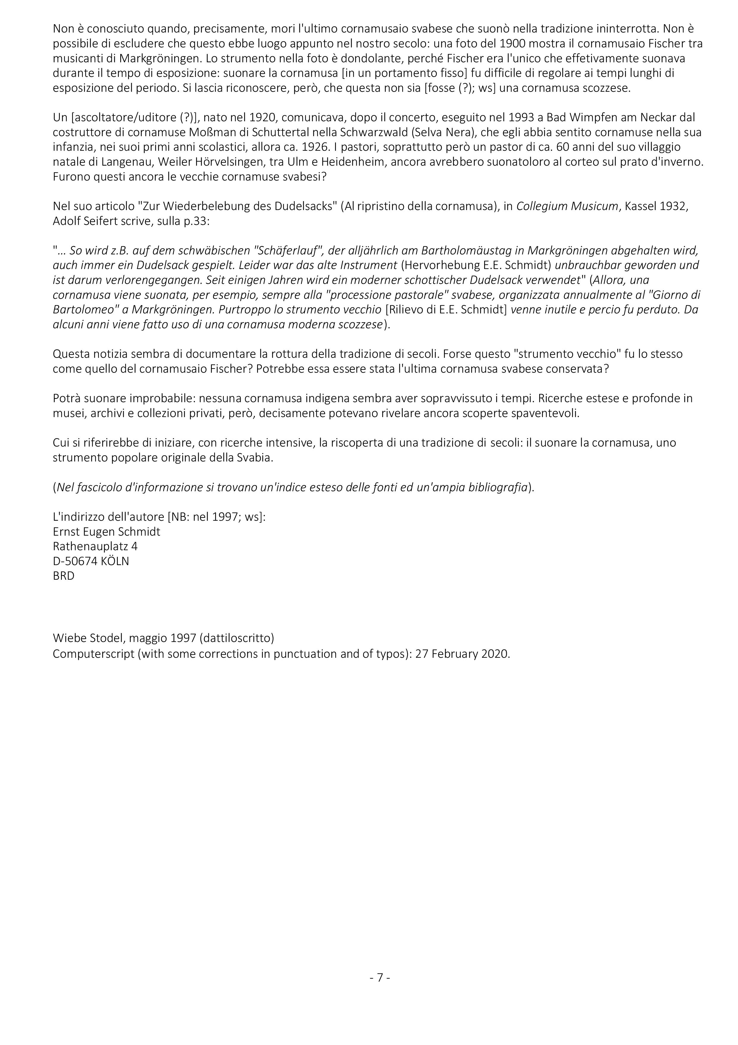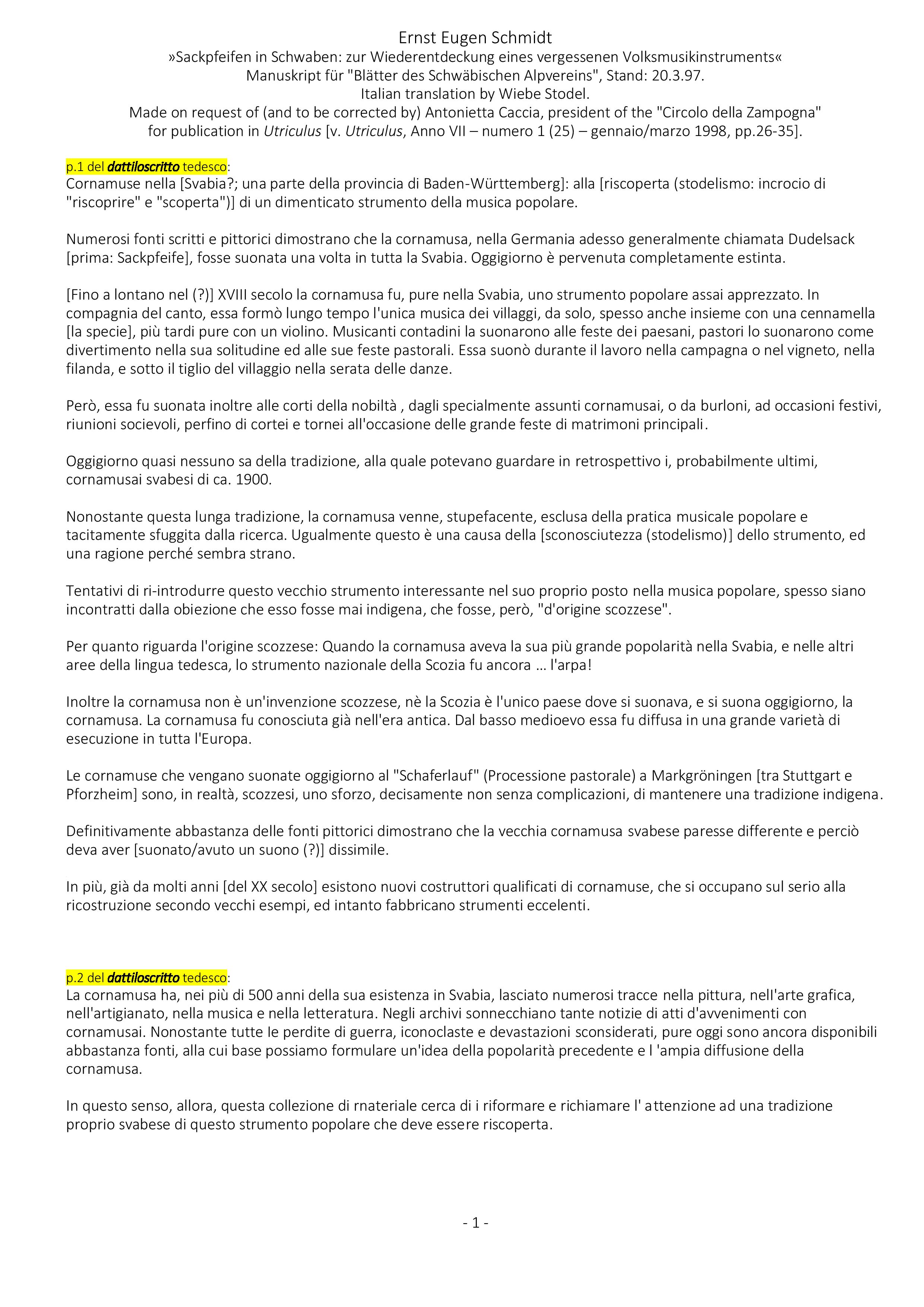 Italian translation of Ernst Eugen Schmidt, »Sackpfeifen in Schwaben: zur Wiederentdeckung eines vergessenen Volksmusikinstruments«: Manuskript für "Blätter des Schwäbischen Alpvereins", Stand: 20.3.97. Made on request of Antonietta Caccia, president of the "Circolo della Zampogna", for publication in Utriculus. 1997 (7 p.). NB: ➺ Utriculus VII;1 (25) (1998), p.26-35