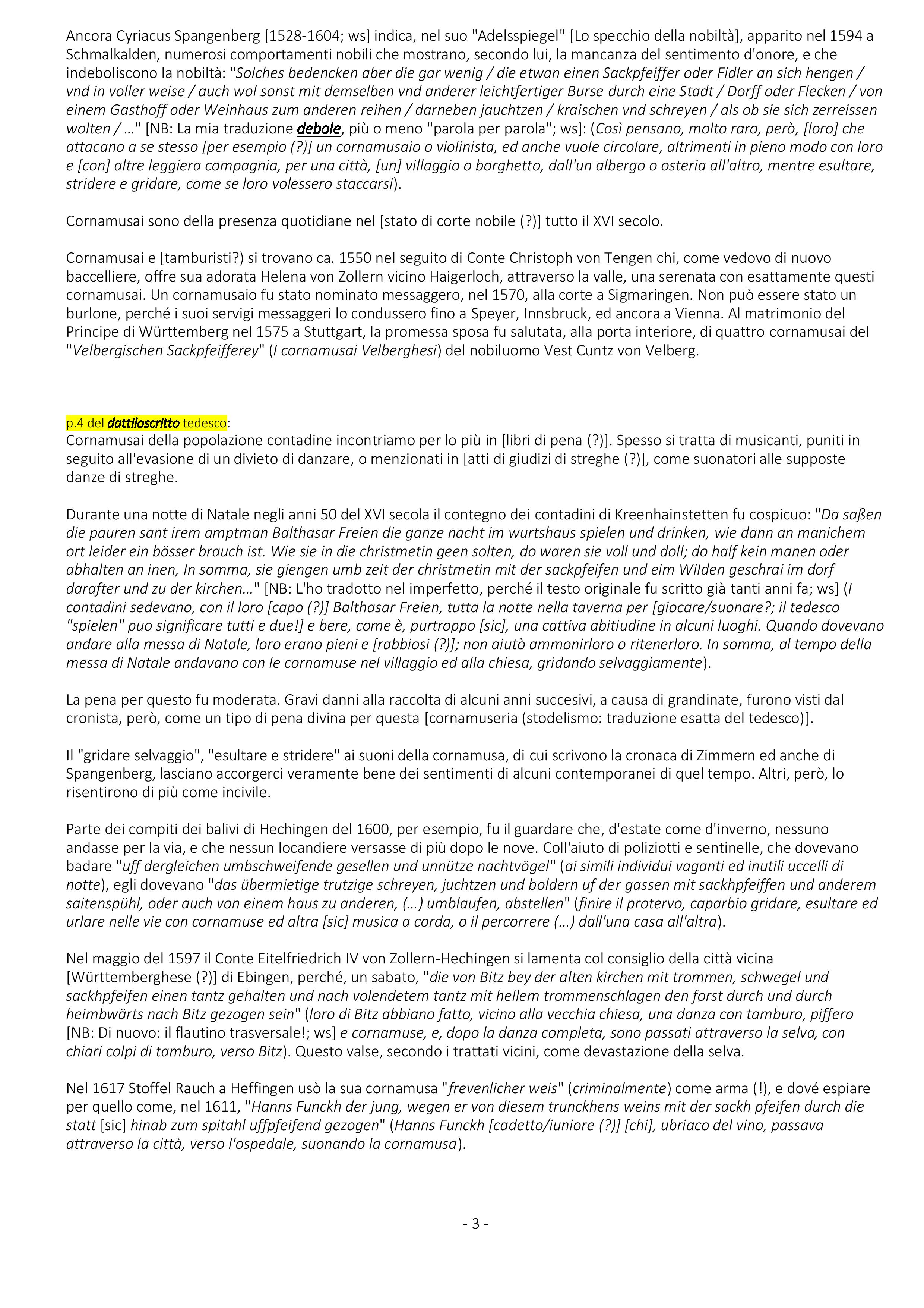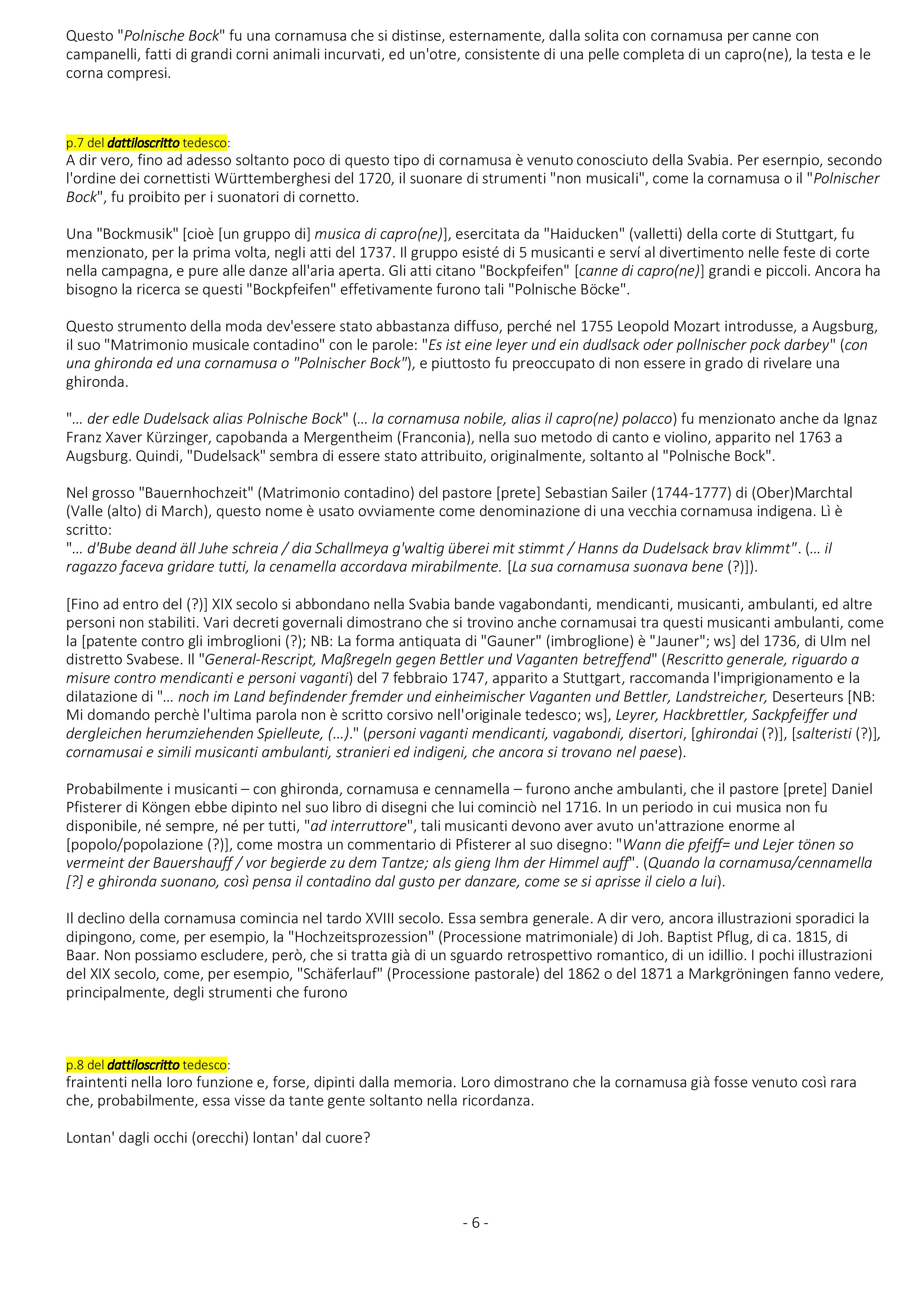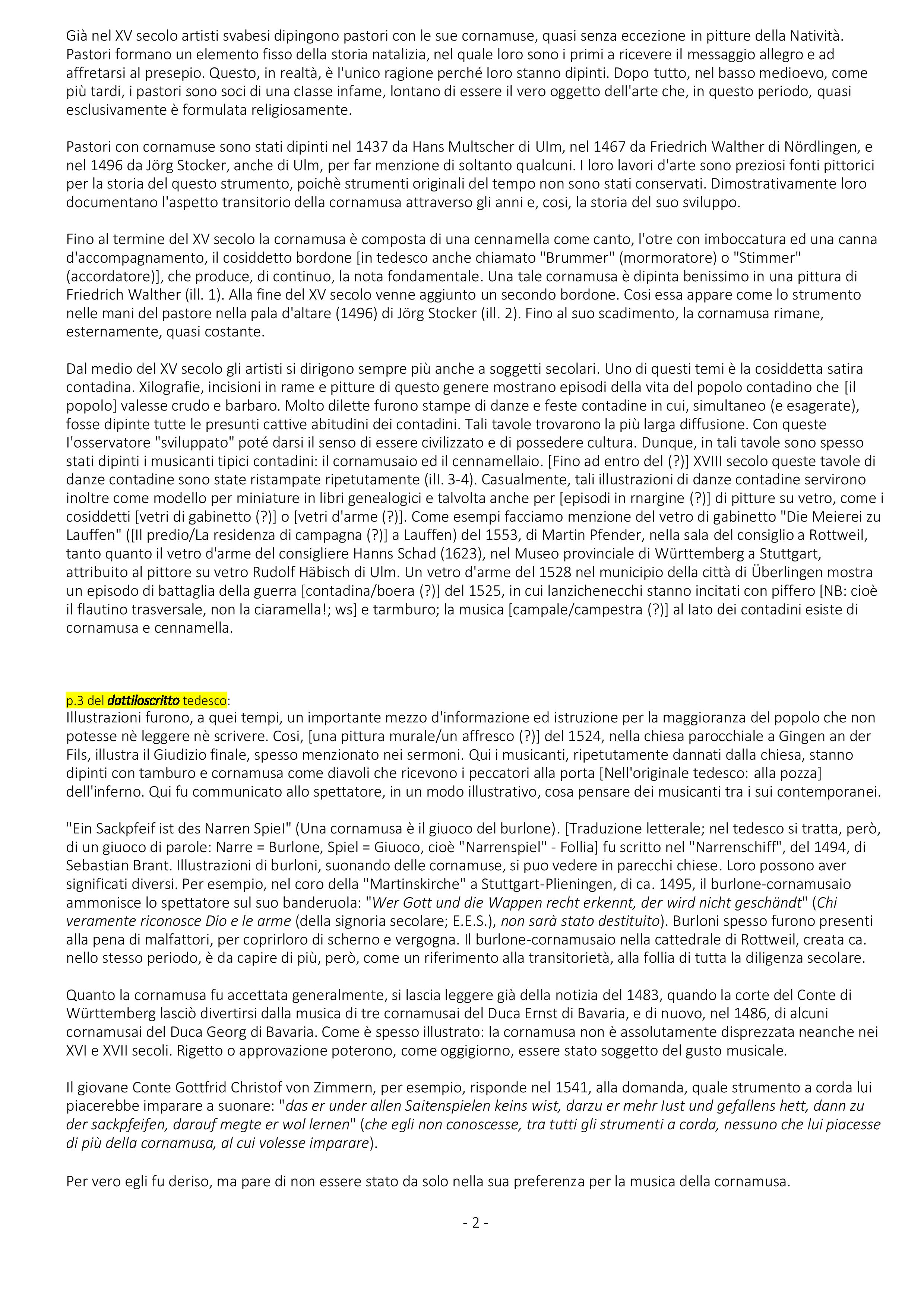 Italian translation of Ernst Eugen Schmidt, »Sackpfeifen in Schwaben: zur Wiederentdeckung eines vergessenen Volksmusikinstruments«: Manuskript für "Blätter des Schwäbischen Alpvereins", Stand: 20.3.97. Made on request of Antonietta Caccia, president of the "Circolo della Zampogna", for publication in Utriculus. 1997 (7 p.). NB: ➺ Utriculus VII;1 (25) (1998), p.26-35